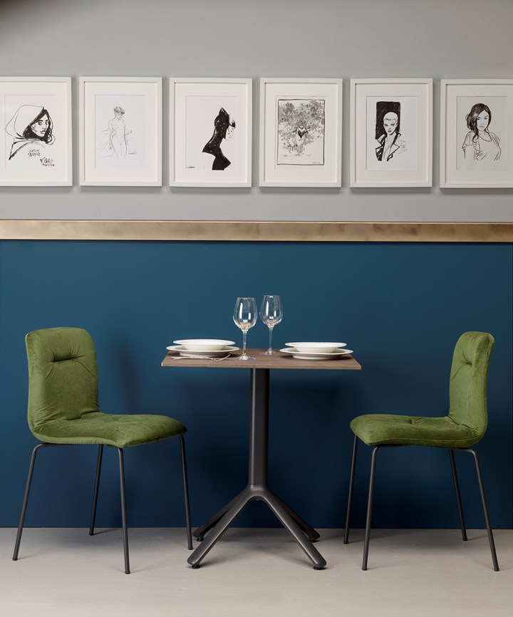 Конструкция из массива натурального бука с бархатной обивкой создает утонченную винтажную атмосферу. Металлическая версия сохраняет сдержанное очарование благодаря прочным стальным ножкам.