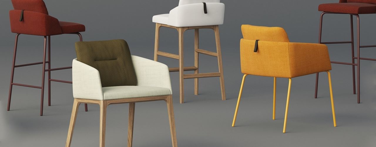 Коллекция включает в себя разнообразные элементы мебели, такие как кресла, пуфы и столы, которые могут быть персонализированы в зависимости от нужд офиса.