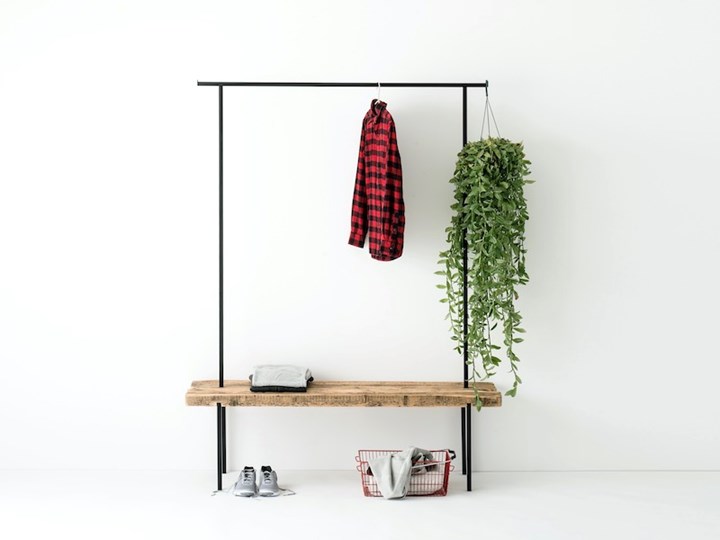 Коллекция включает ключницы, полки для картин, настенные полки, скамьи и вешалки для одежды, все из которых выполнены из старинного дерева и металла с порошковым покрытием.