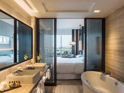 Продукция Dornbracht, как смесители и душевые системы, интегрирована в оформление отеля Sheraton, создавая стильный и элегантный интерьер.