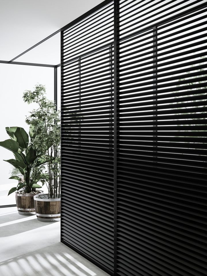 Levante отличается уникальной зеркальной поверхностью из алюминиевых элементов с треугольным сечением. Такой дизайн пропускает свет, ограничивая видимость, что позволяет использовать дверь как внутри, так и снаружи помещения.