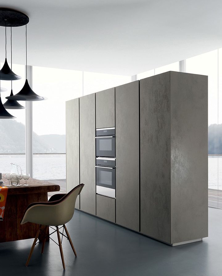 Кухня Glasstone доступна в нескольких вариантах отделки, включая коллекции Oxide и Fokos, которые имитируют металл и камень соответственно.