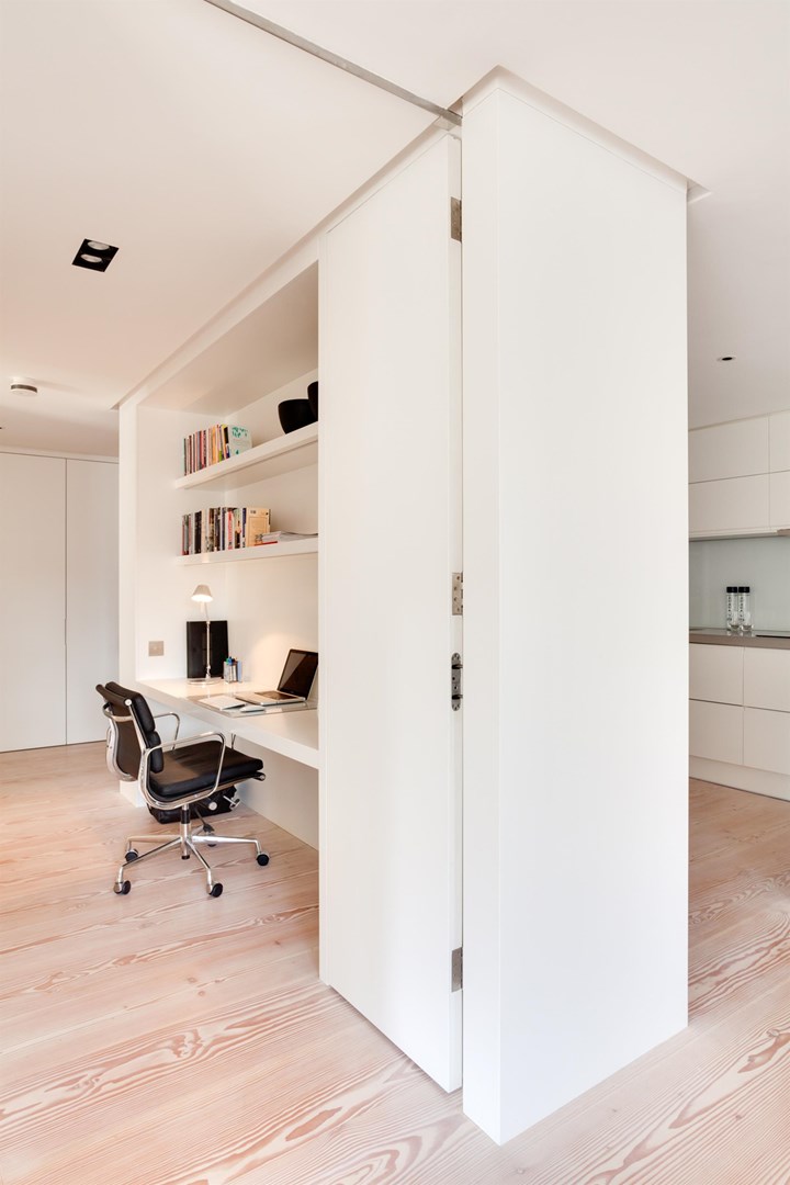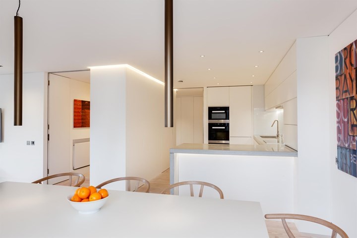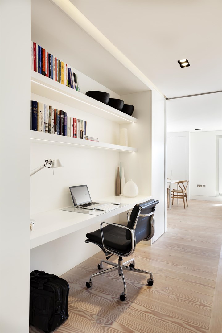 В проекте в Лондоне HI-MACS® использовался для создания функциональных зон, таких как рабочие пространства и кухни, с акцентом на современный дизайн.