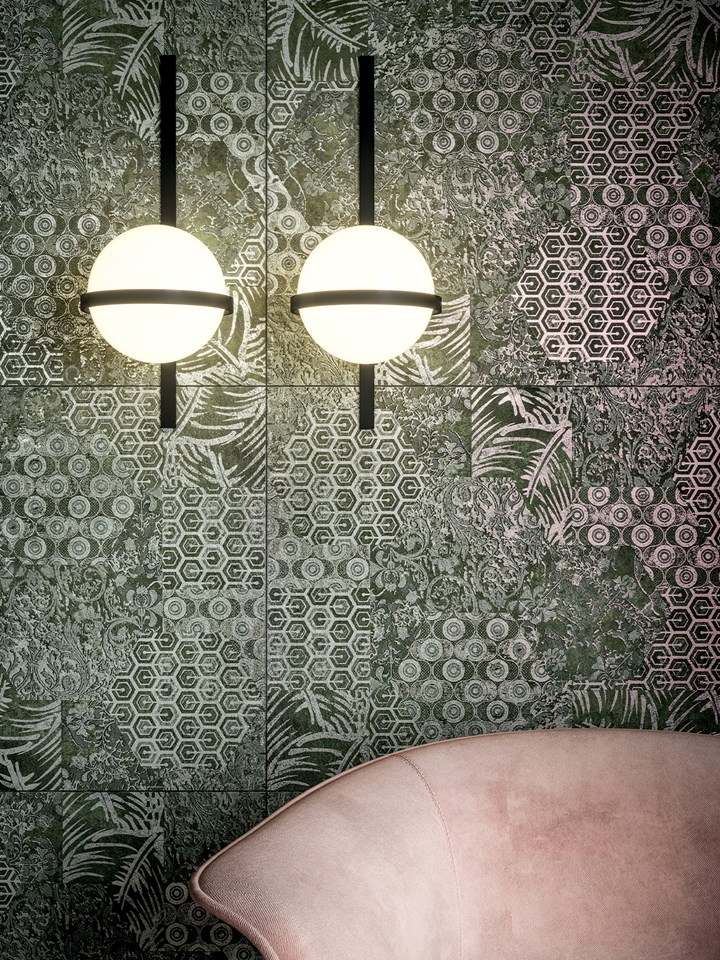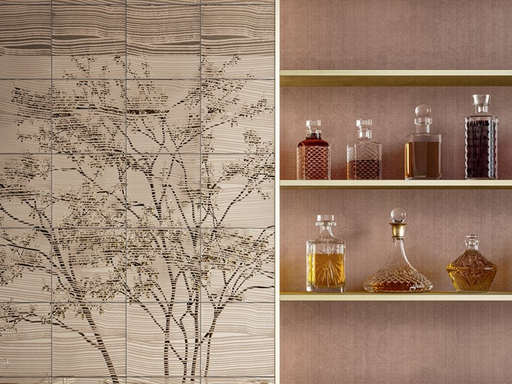 Коллекция включает зеркала с металлическими текстурами и плитку с переливающимися эмалями. Эти элементы создают уникальные световые эффекты, изменяя восприятие пространства.