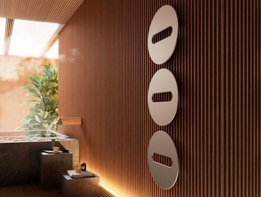 Радиатор Extraslim Badge® представлен в вертикальной версии и обладает изменяемой геометрией, что позволяет ему адаптироваться к любым интерьерным решениям. Sfere, получивший награду ADI Design Ceramics, отличается триптихной композицией, символизирующей бесконечное умножение.