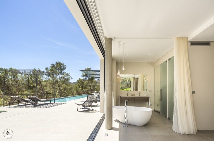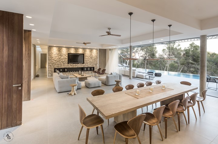 Выбор материалов играет ключевую роль. Например, в проекте виллы на Ибице использованы теплые и нейтральные оттенки, такие как серо-коричневый и бежевый. Эти цвета гармонируют с природой, создавая плавный переход между архитектурой и окружающим ландшафтом.
