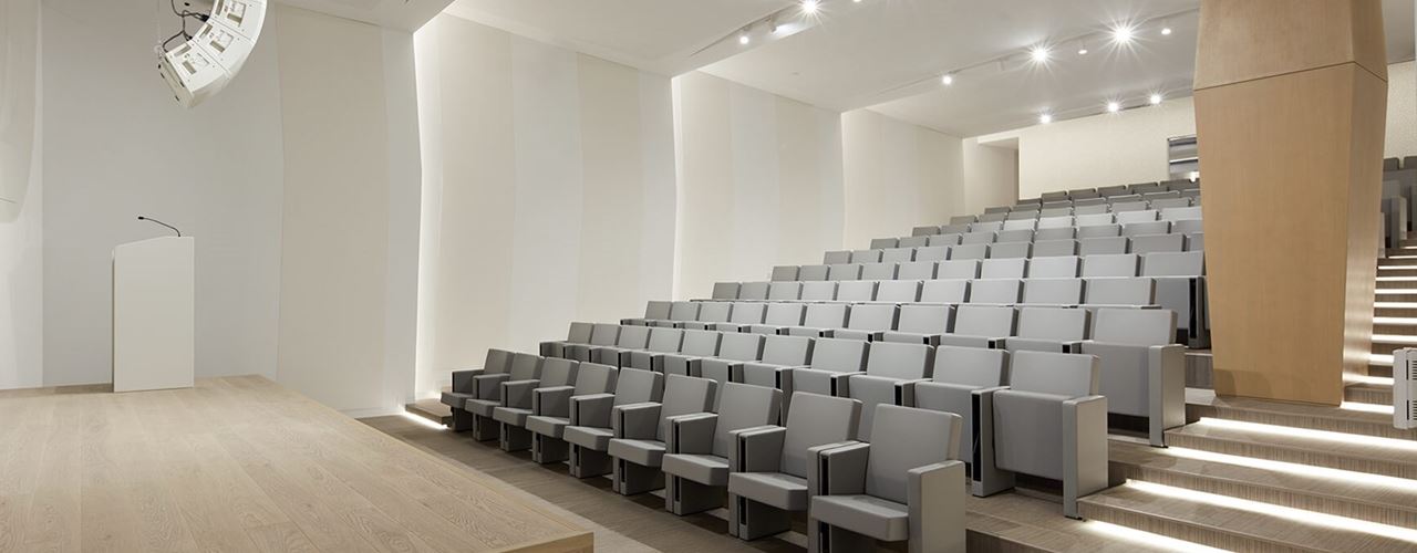 Для комфортного размещения зрителей в аудитории использованы кресла F50 от LAMM. Эти кресла обтянуты искусственной кожей и оснащены откидными сиденьями, обеспечивая удобство и эргономику. Благодаря многоуровневому расположению, зрители могут наслаждаться презентациями и мероприятиями без помех.