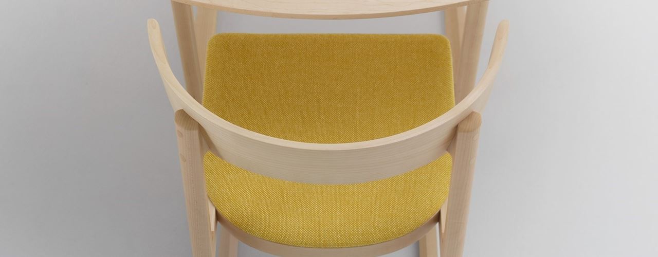 Коллекция включает в себя стулья и столы из древесины клена с текстильной или кожаной обивкой. Круглые формы и изогнутые линии придают мебели элегантность и комфорт.