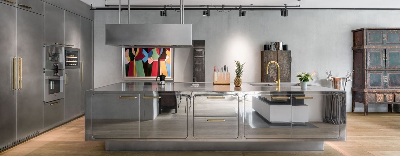 Кухня Ego включает отделку из латуни и зеркальные поверхности, что придает ей уникальный стиль.