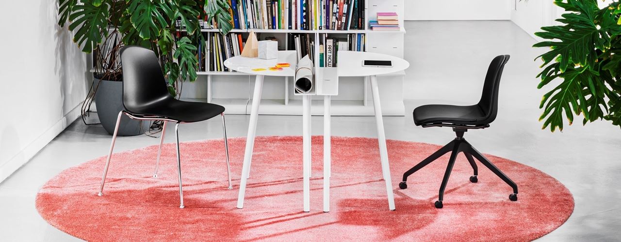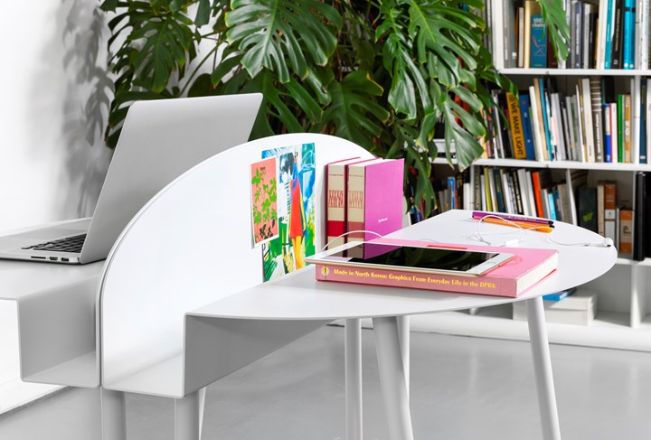 Мягкие и округлые линии стола обеспечивают комфорт. Металлическая пластина, вырезанная лазером, служит для хранения электрики. Доступен в трех вариантах отделки и шести цветах.