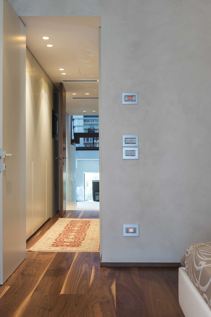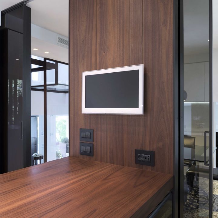 Современные технологии, такие как система домашней автоматизации By-me от Vimar, обеспечивают комфорт и удобство. Устройства управления гармонично вписаны в интерьер, подчеркивая его элегантность.