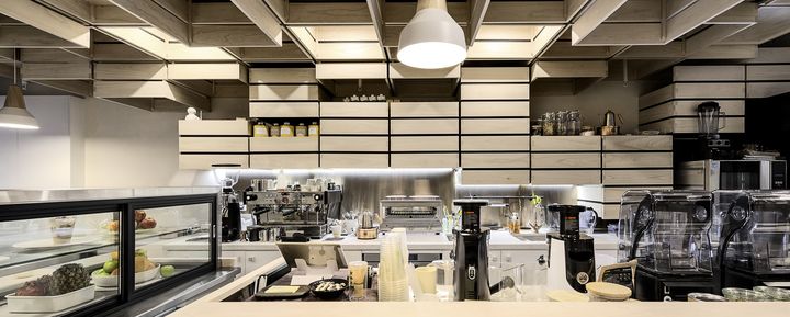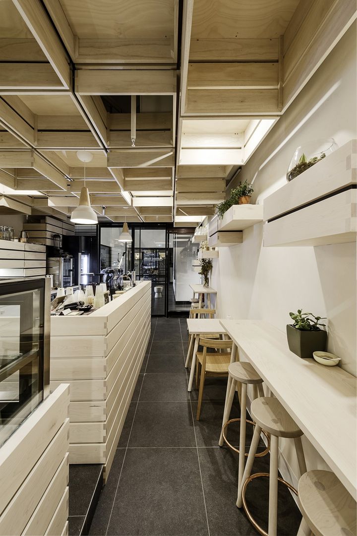 Современные интерьеры кафе часто стремятся к уникальности и функциональности. Примером такого подхода стал проект архитектора Кея Китаймы, который использовал подвесные ящики для фруктов в дизайне кафе Hunters Roots и Juice Bar в Мельбурне. Эти элементы не только создают скульптурные формы, но и оптимизируют пространство.