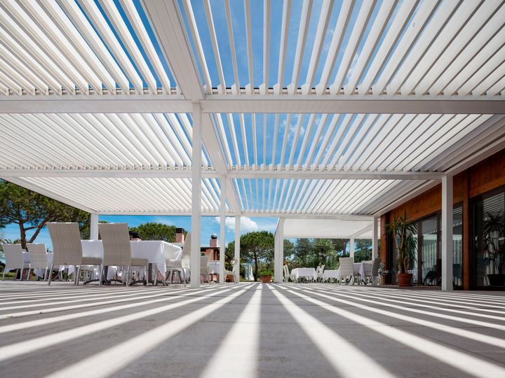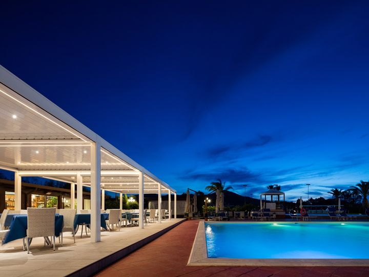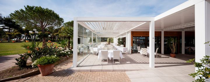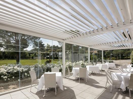 Беседки Opera оснащены регулируемыми алюминиевыми лопатками для естественной вентиляции и светодиодным освещением для вечернего времени, что делает их идеальными для отелей.