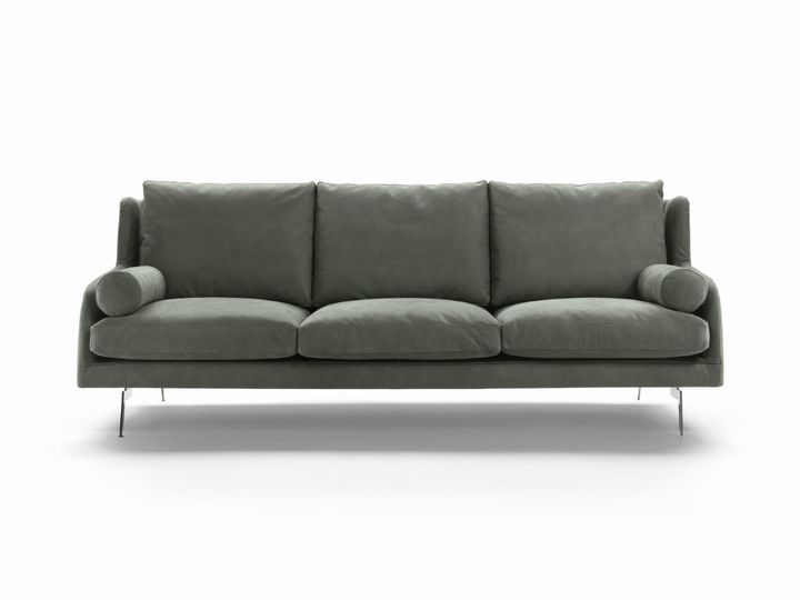 Диван Larseen имеет хромированные ножки и доступен в тканях меланж и зеленой коже. Он идеально подходит для стильных интерьеров.