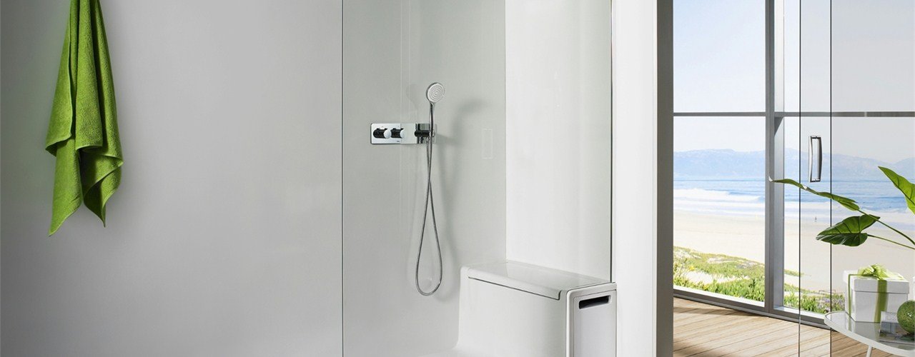 Модель Hide & Seat оснащена поддоном с интегрированным сиденьем и местом для хранения, идеально подходящим для небольших ванных комнат.