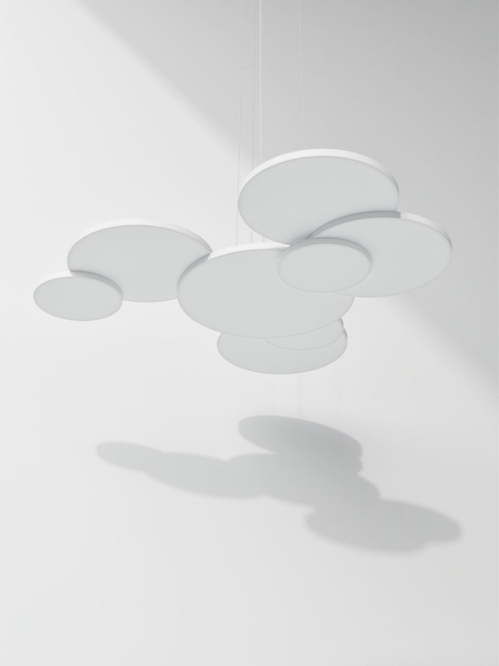 Перекрытие — это подвесной светильник, который можно настраивать по форме благодаря перекрывающимся алюминиевым дискам. Это идеальное решение для тех, кто ценит гибкость и креативность в дизайне.