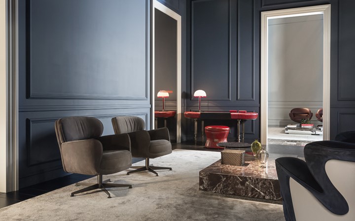 Коллекции Mascheroni предлагают уникальные смеси фактур, форм и материалов, сочетая мрамор, дерево и кожу в смелых дизайнерских решениях.