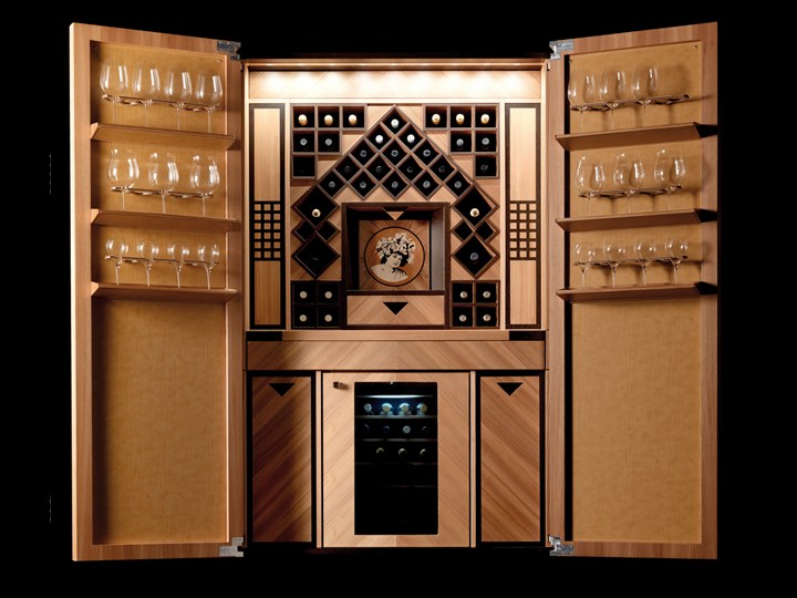 В проекте представлены винные колонны, которые сочетают винтаж и современные технологии, такие как инкрустация и использование дорогих материалов.