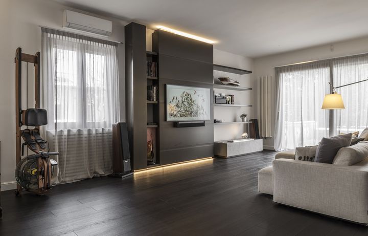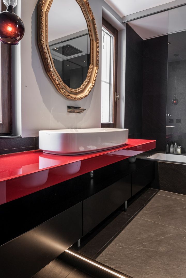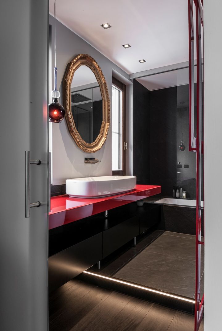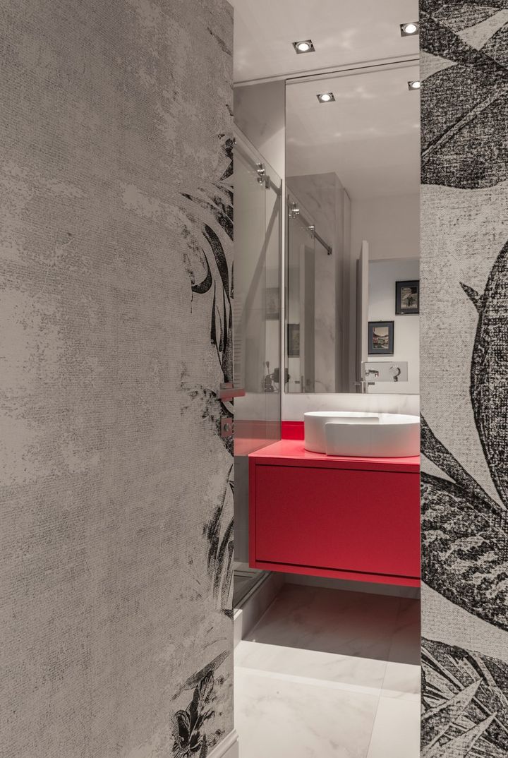В проекте Ritmonio использованы красные акценты в ванной комнате, которые выделяют детали и создают уникальный стиль. Смесители серии Haptic подчеркивают современность и функциональность интерьера.
