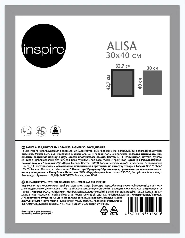 Фоторамка Inspire Alisa в сером цвете 30x40 см 87971964