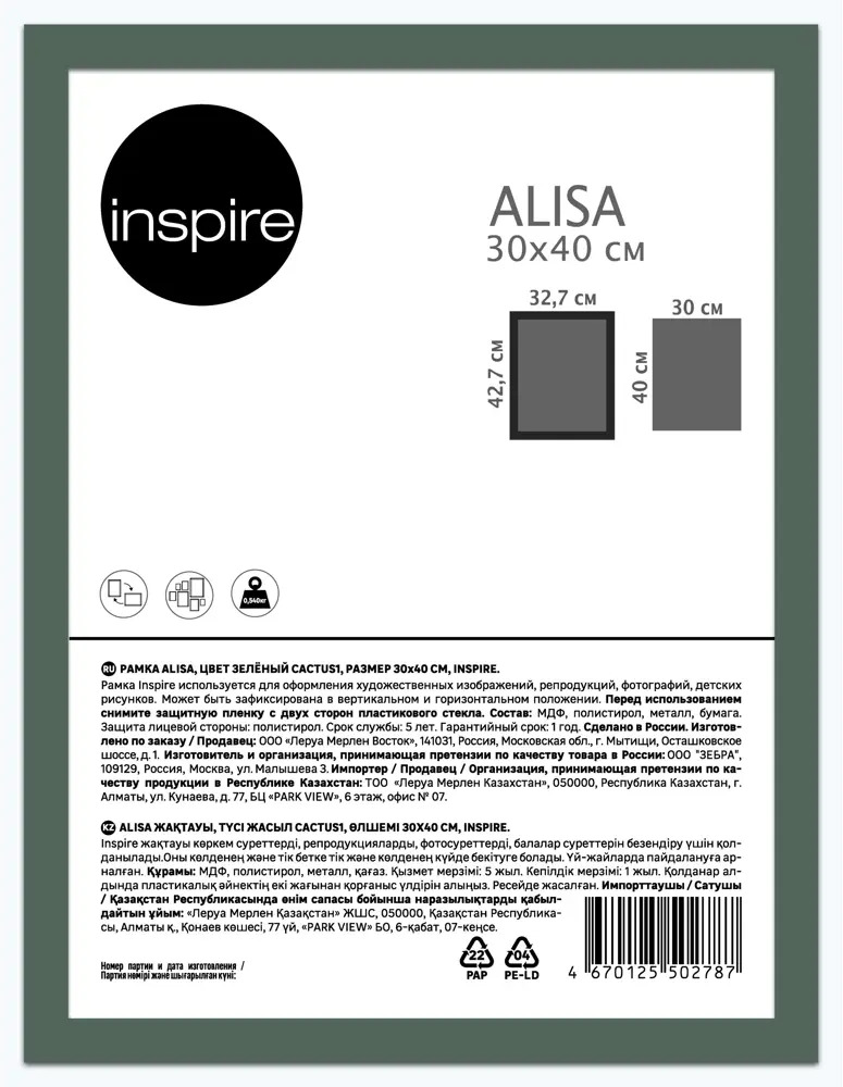 Фоторамка Inspire Alisa в изумрудном цвете для фотографий и документов 87971962