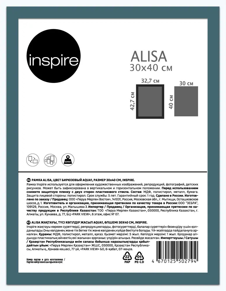 Фоторамка Inspire Alisa бирюзовая для фото и документов 87971958