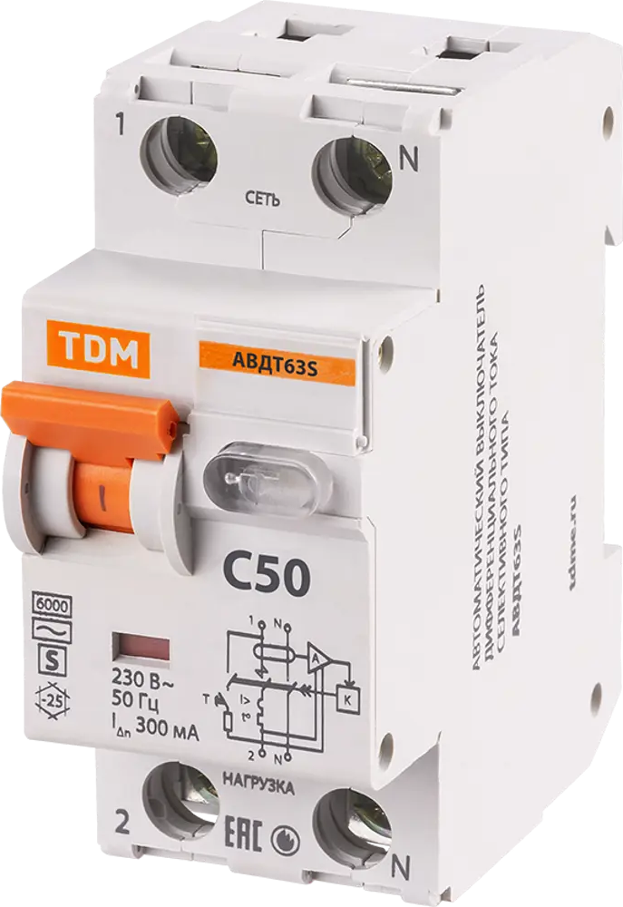 Дифференциальный автомат TDM Electric АВДТ63 1Р N 50А с защитой от утечек 84399458