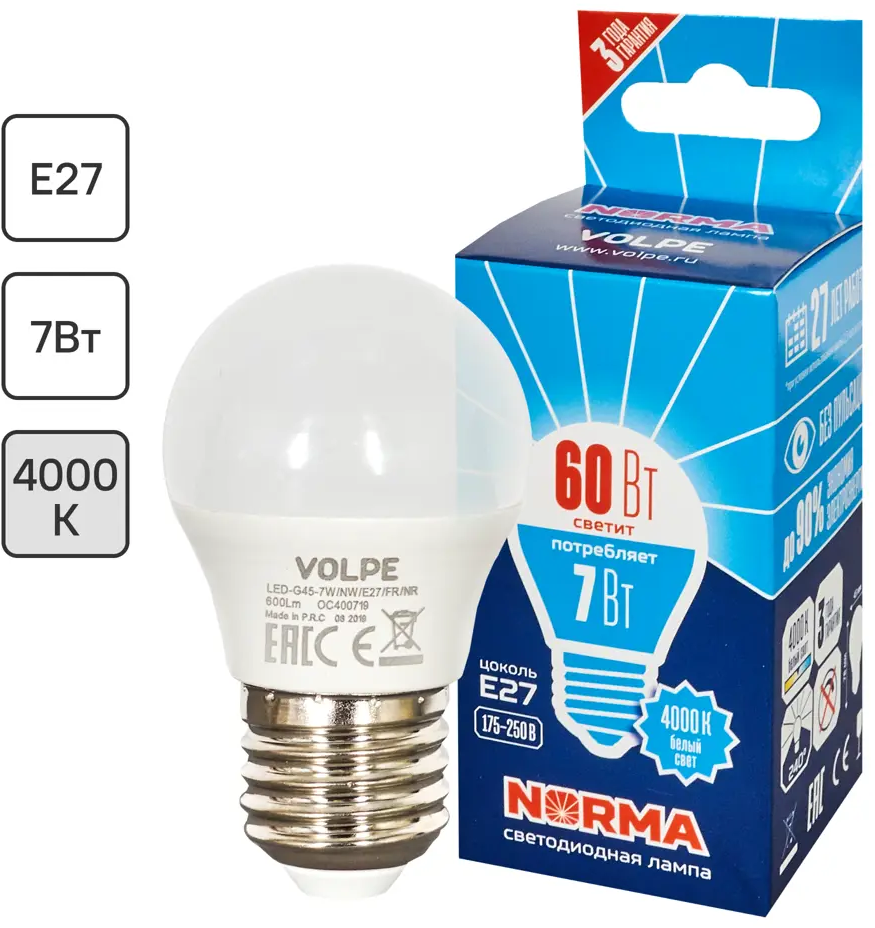 Светодиодная лампа Volpe Norma E27 7Вт шар нейтральный белый свет 82314007