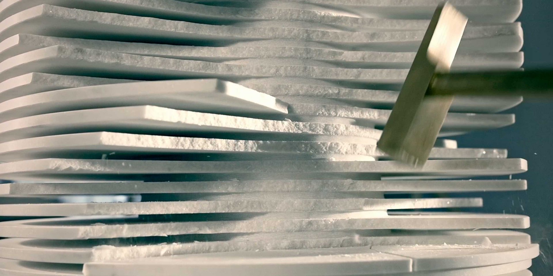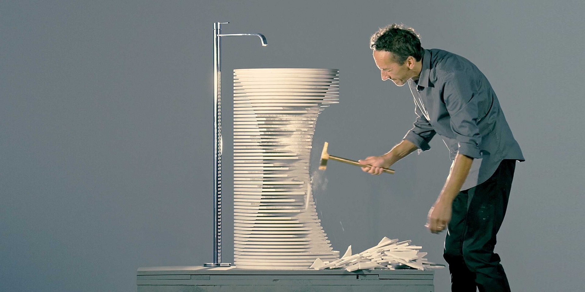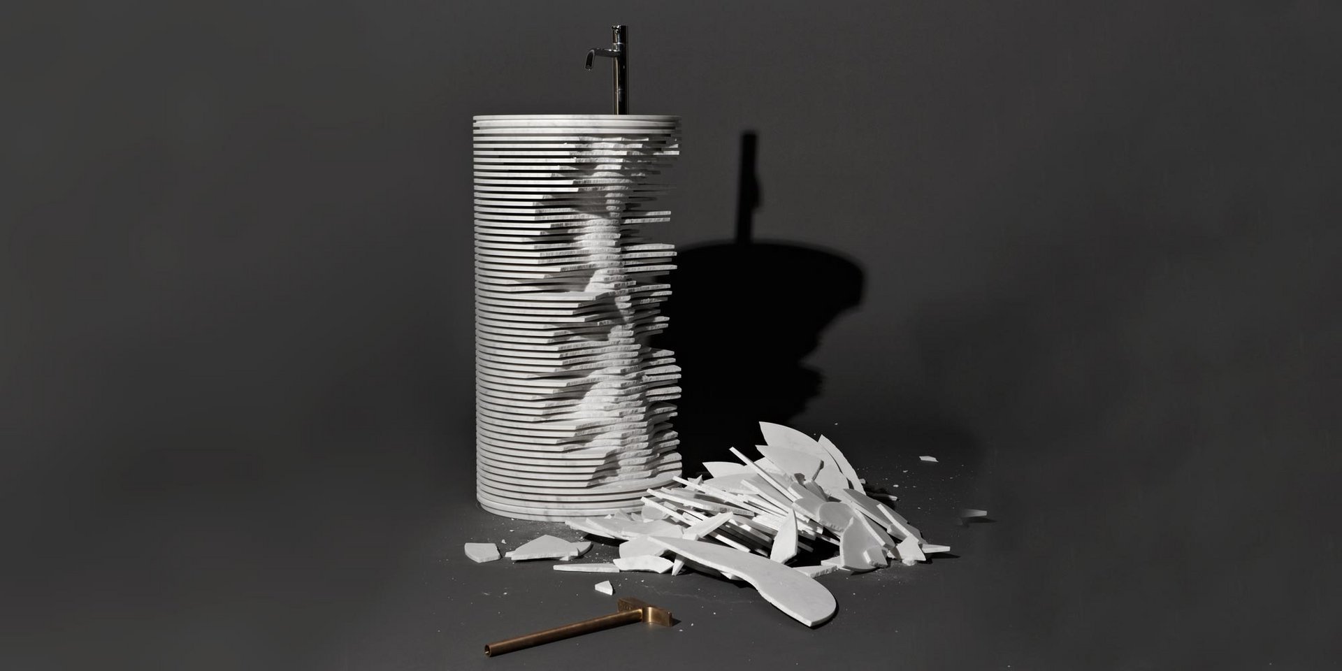 Идея этого умывальника родилась при наблюдении за грубой обработкой мраморных скульптур, в которой трехмерная форма скульптуры очерчена последовательными ступенями и на разной глубине алмазного диска, управляемого машиной с числовым программным управлением.
