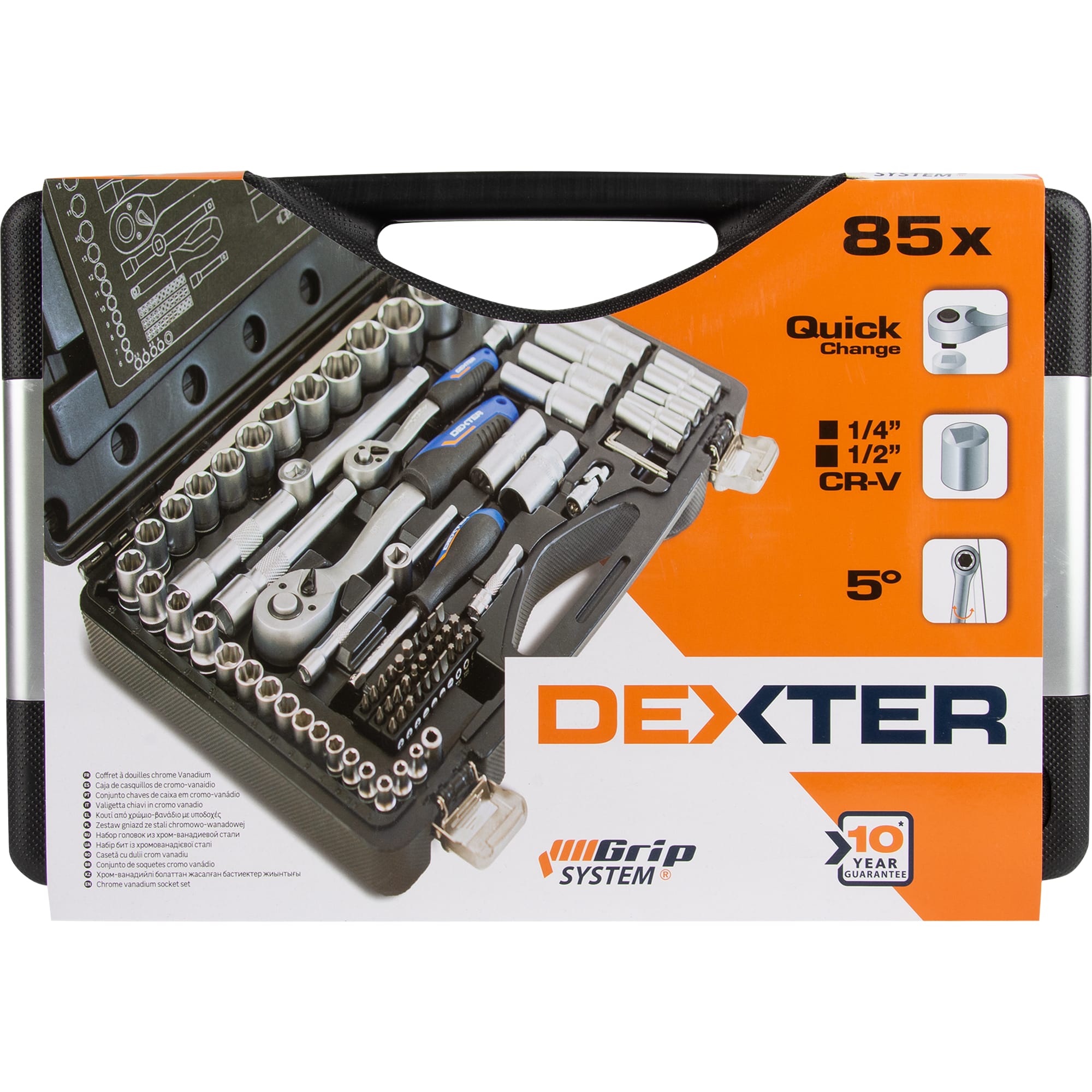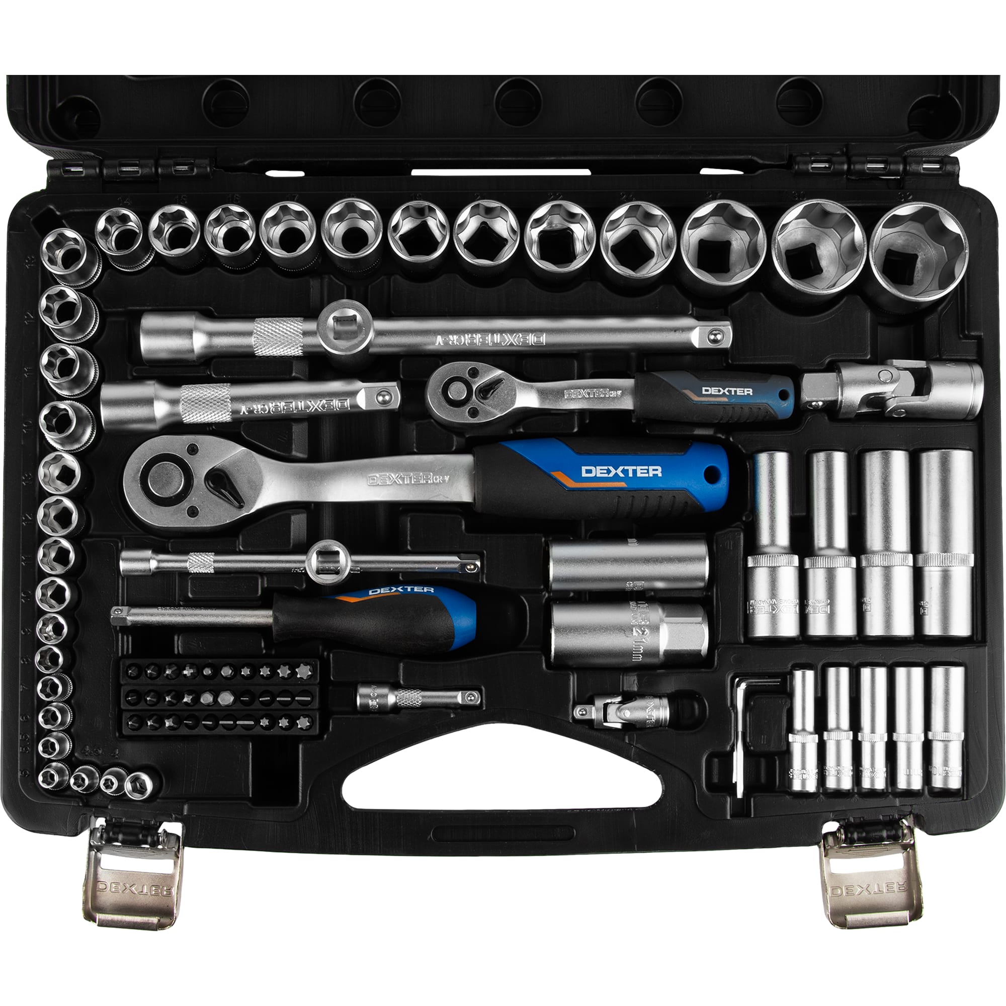 Набор головок Dexter предлагает комплексное решение для бытового и профессионального использования с 85 надежными элементами в удобном кейсе.