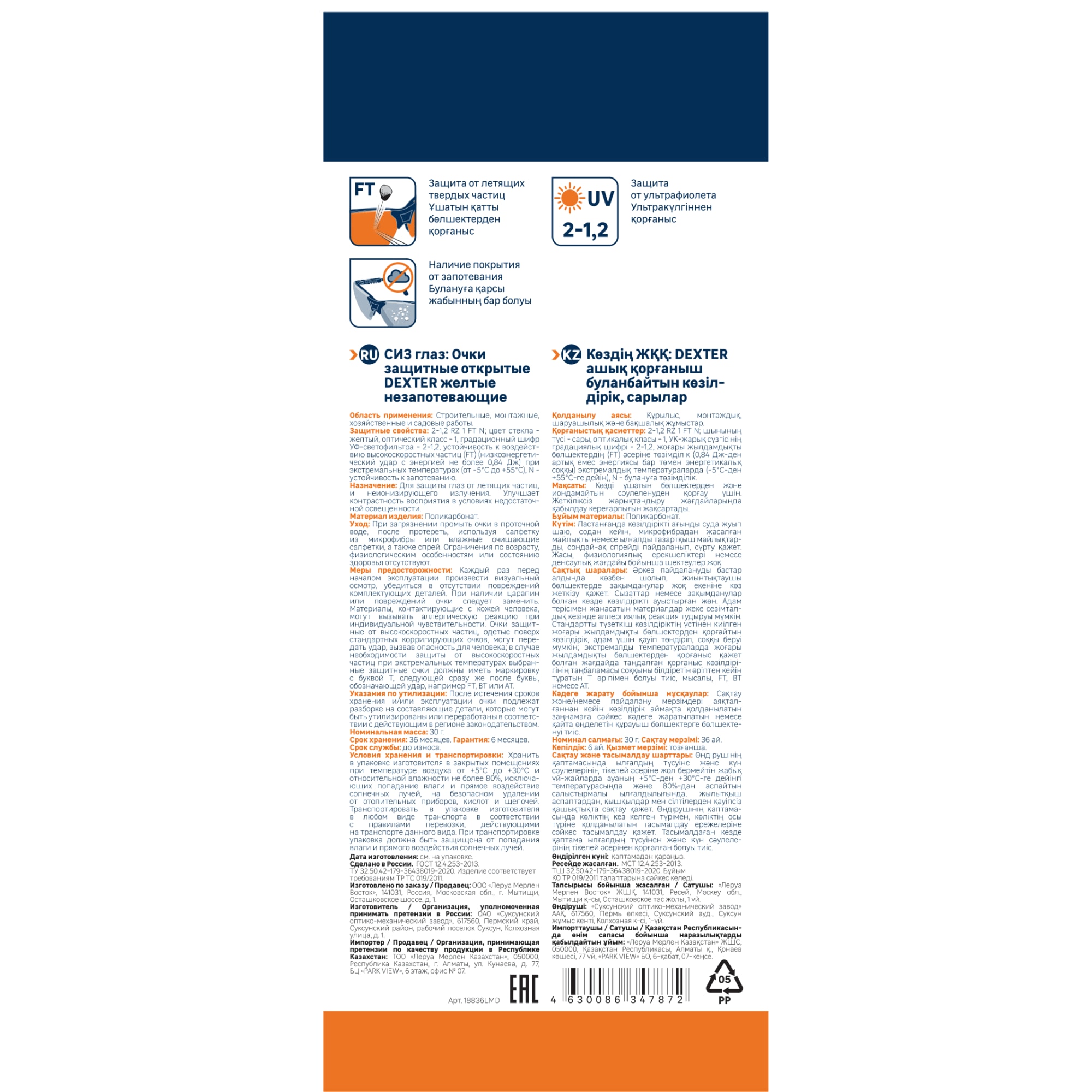 | Модель продукта | Очки защитные открытые DEXTER желтые нез |