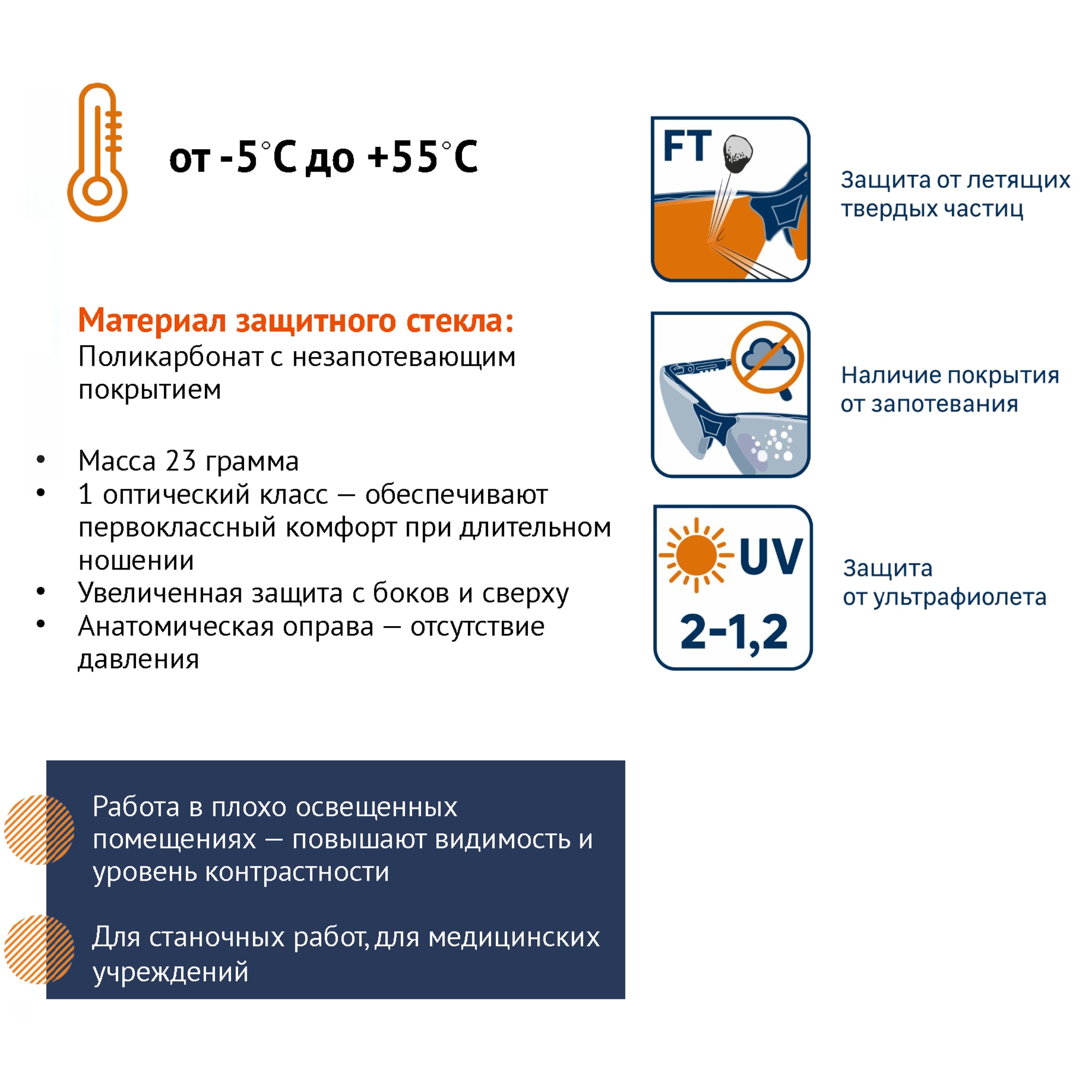 Легкая эргономичная модель с повышенной ударопрочностью, идеальное решение для работ с риском повреждения органов зрения. Поликарбонатные линзы обеспечивают комплексную защиту от высокоскоростных частиц, брызг жидкостей и ультрафиолетового излучения.