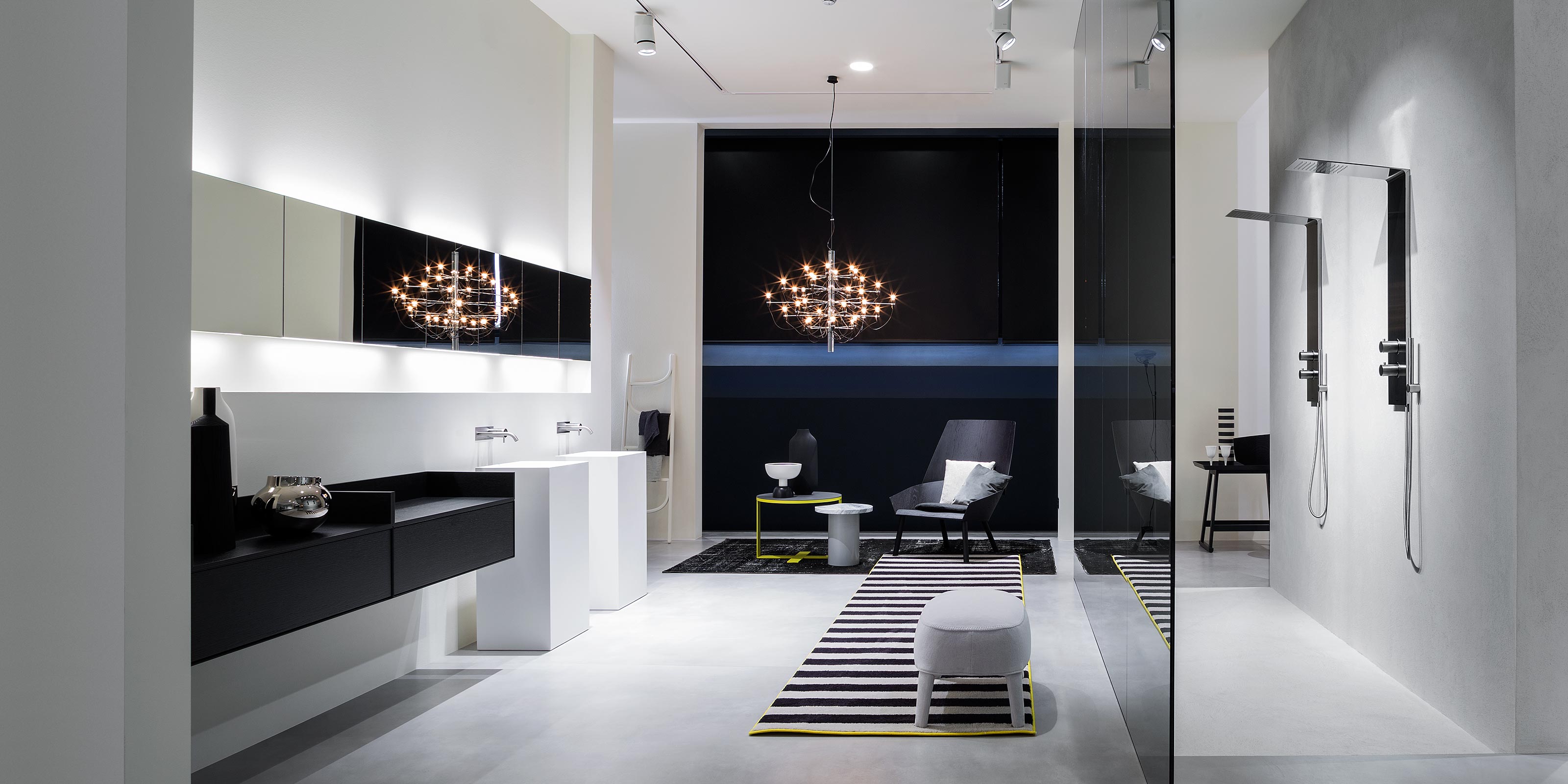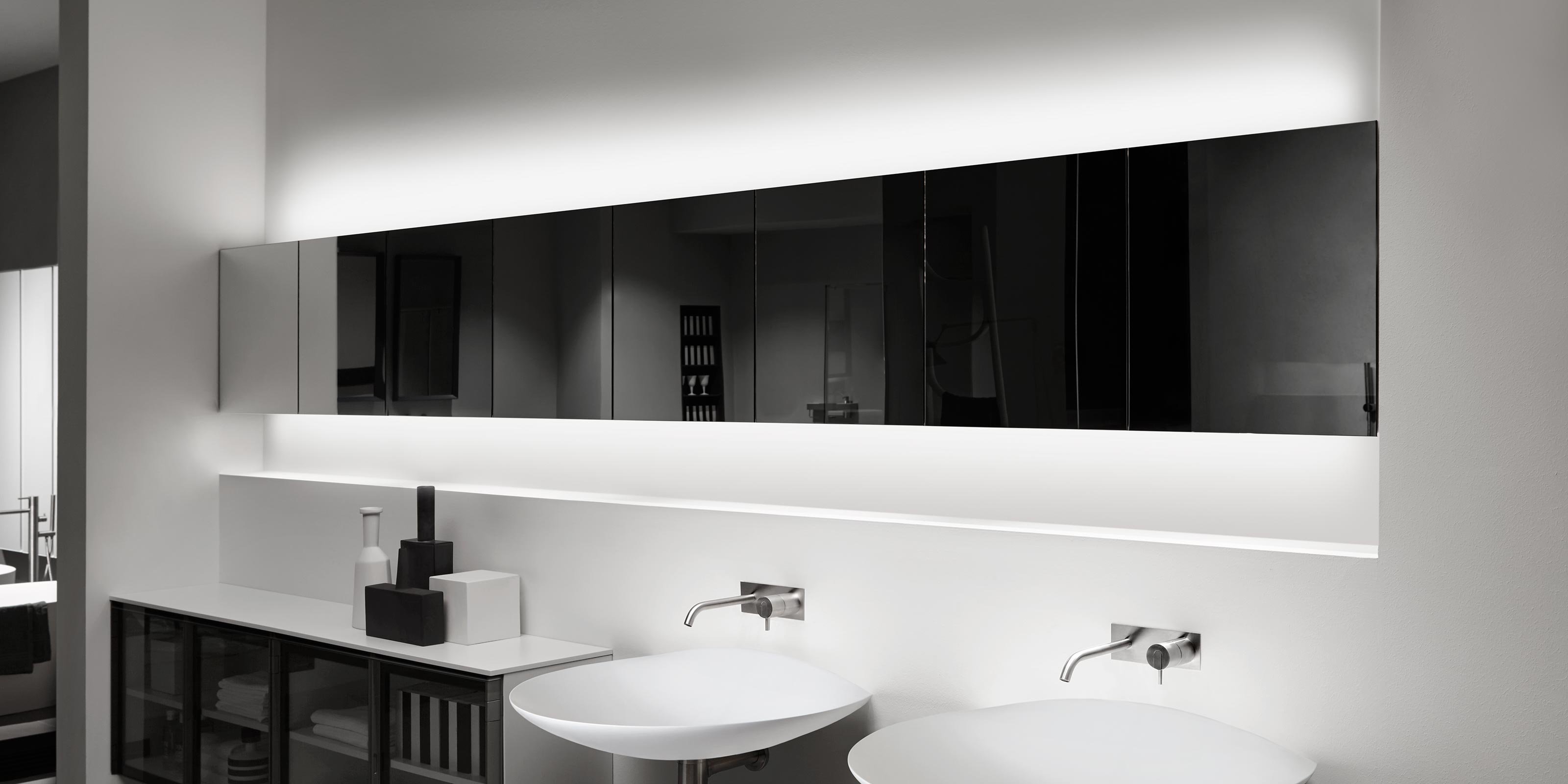 Незаменимый, абсолютный, без каких-либо украшений. Чистая геометрия, резкость краев и идеальные углы описывают изображение, которое может вписаться в любой контекст. Расположенный последовательно, Mantra - это настенный шкаф с двумя двусторонними зеркальными дверцами, который сочетает в себе эстетику и функциональность, просто повесив его на стену или утопив в нише.