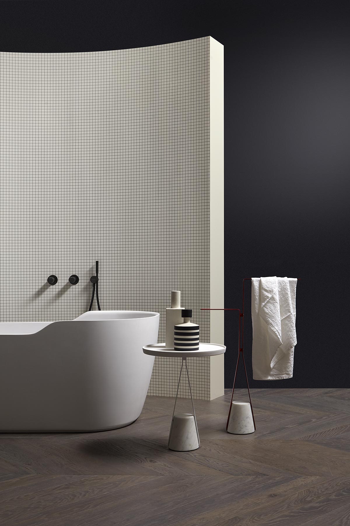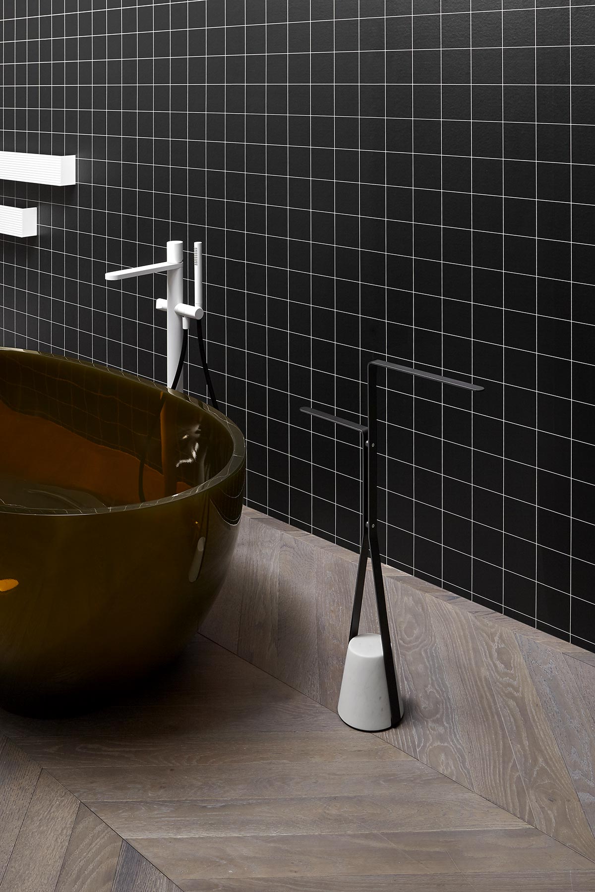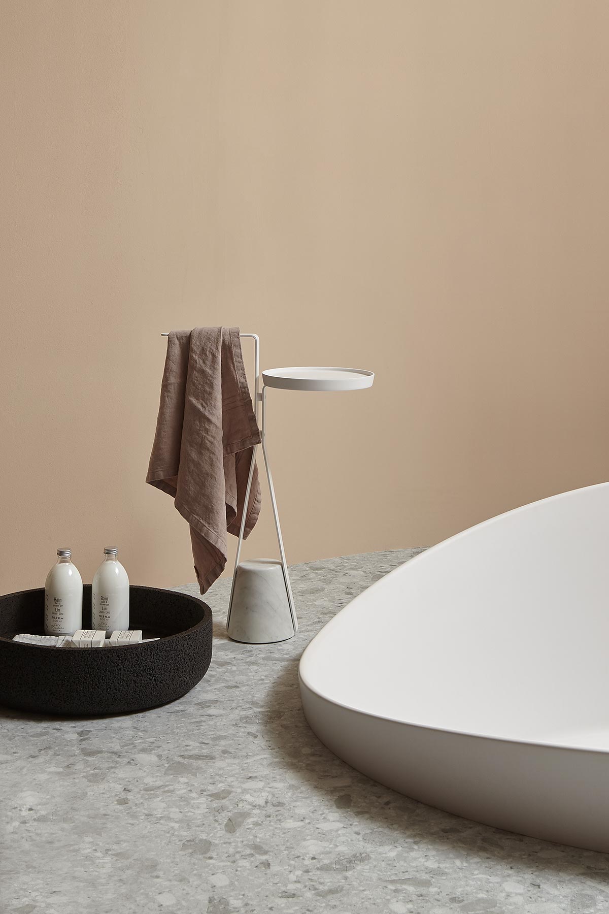 Материальный характер основания, элегантный путь, описываемый структурой, объединяются для баланса, который возникает из контраста между желанием парить в воздухе и силой тяжести, которая ему противодействует, чтобы закрепить его на земле. Как резинка, которую тянут вниз, но которая затем находит сопротивление и постоянство, чтобы в свою очередь стать опорой. Halo - это семейство отдельно стоящих аксессуаров и столов, которые меняют образ функционального элемента для повседневного использования внутри ванной комнаты, но могут также использоваться в других комнатах дома, например, в версии с дверным ограничителем. Атласный каррарский мрамор как отличительная черта, латунная металлическая структура, доступная в различных цветах, которые предлагает antoniolupi, и профиль, позволяющий найти место встречи на определенной высоте, с которой можно развивать различные конфигурации. Например, в настольной версии круглый поднос из Flumood или Colormood обеспечивает удобную опорную поверхность для размещения предметов, предназначенных для личной гигиены, и для проведения индивидуальных оздоровительных ритуалов.