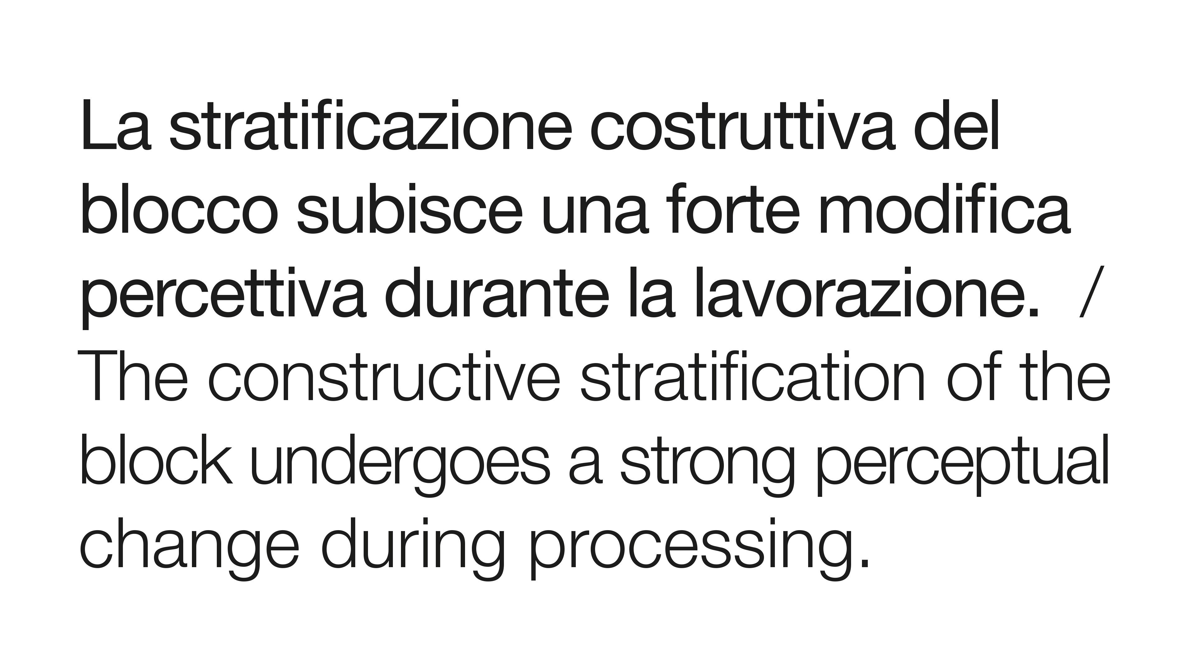 Визуальное восприятие горизонтальной линии изменяет ритм глубины, изменяя ее размерный эффект. Конструктивная стратификация блока претерпевает сильные изменения восприятия во время обработки, создавая элегантный оптический эффект.