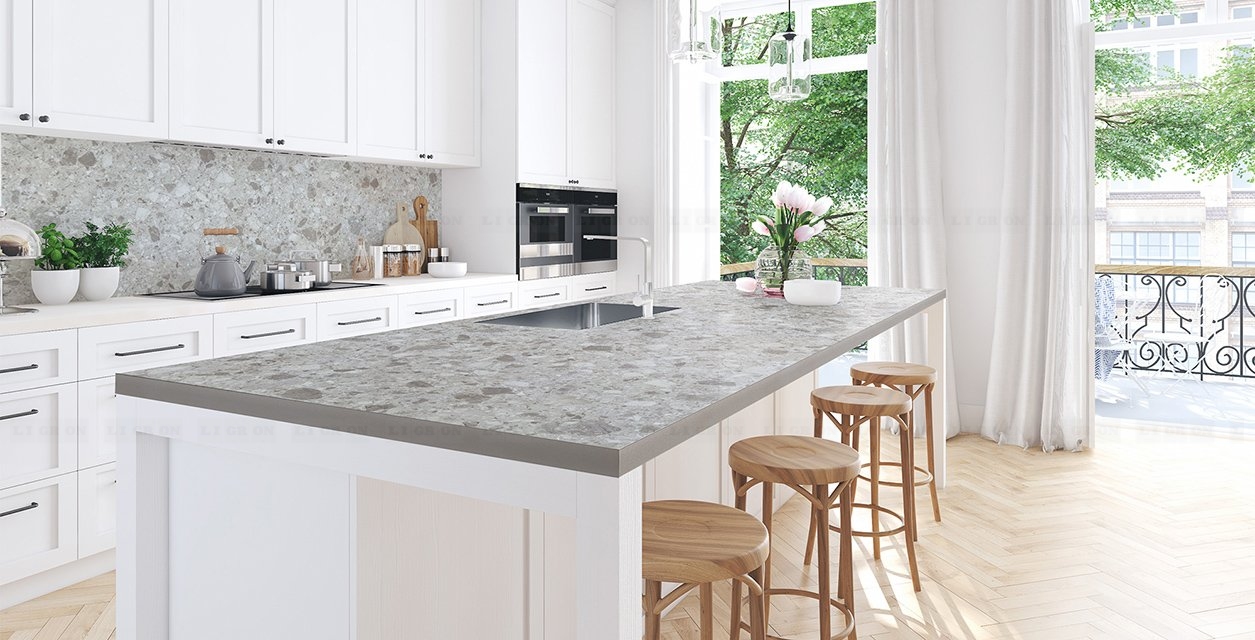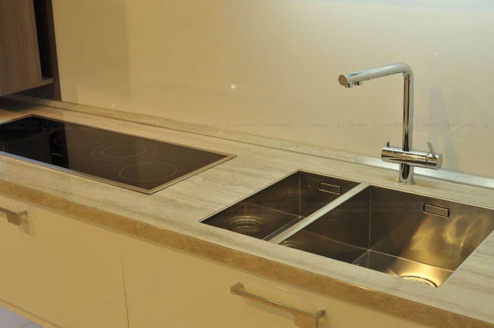 Предлагаются врезные мойки в один уровень со столешницей снизу (только компания Ligron врезает мойки в один уровень со столешницей из ламината снизу. Причем гарантия на все виды врезки моек – 5 лет). В один уровень со столешницей можно врезать разделочный элемент из кварца или керамики.