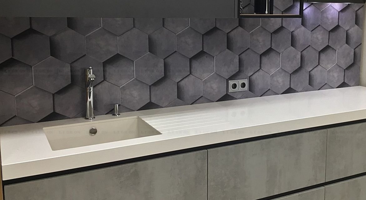 Предлагаются врезные мойки в один уровень со столешницей снизу (только компания Ligron врезает мойки в один уровень со столешницей из ламината снизу. Причем гарантия на все виды врезки моек – 5 лет). В один уровень со столешницей можно врезать разделочный элемент из кварца или керамики.